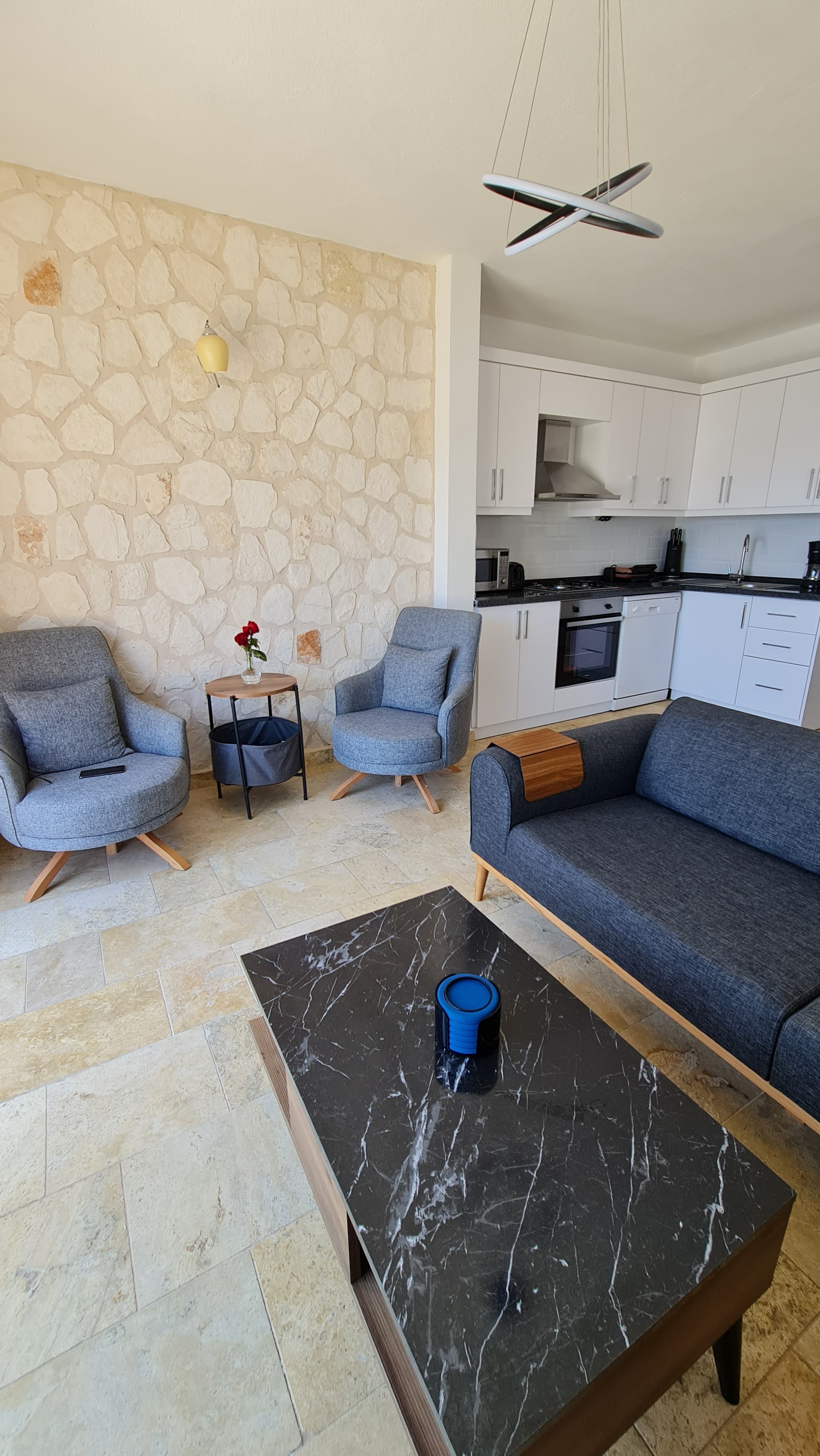 Spacious open-plan living area with fully equipped kitchen
